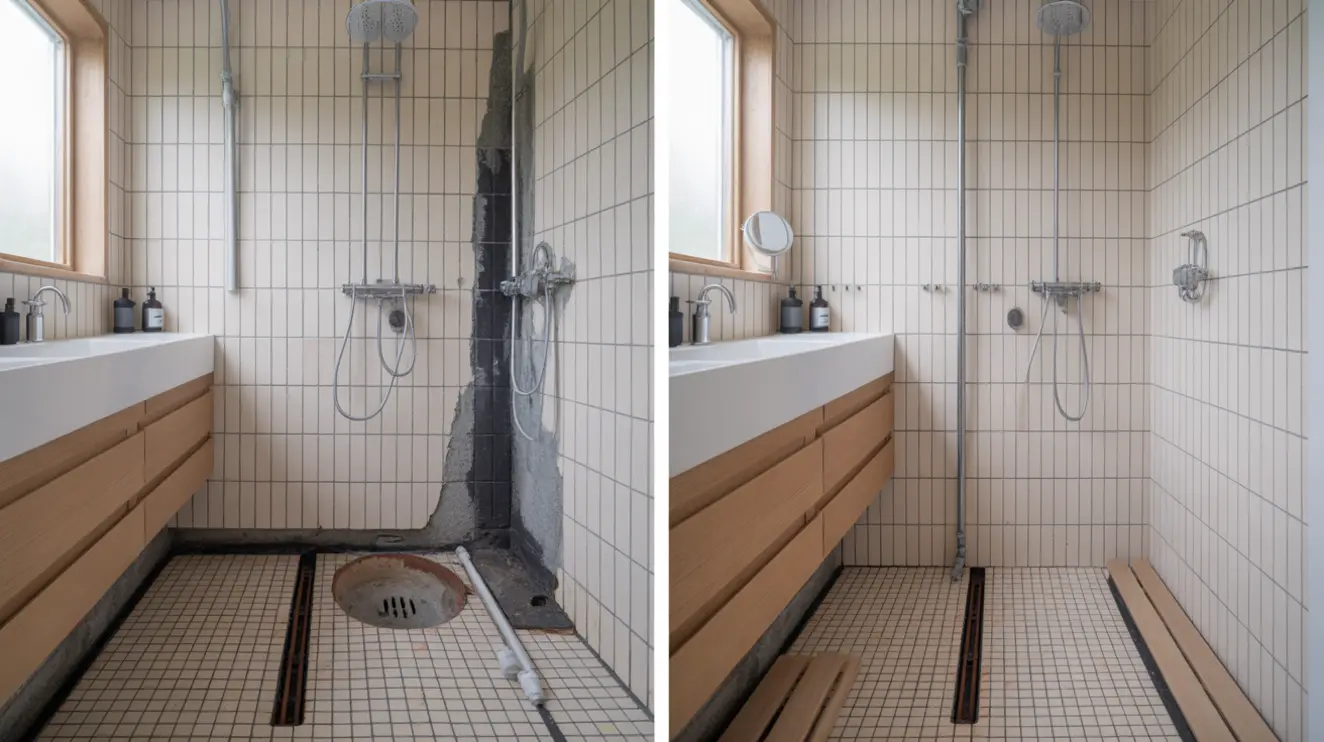 - Riv kontrollerat, byt golvbrunn, säkra stomme